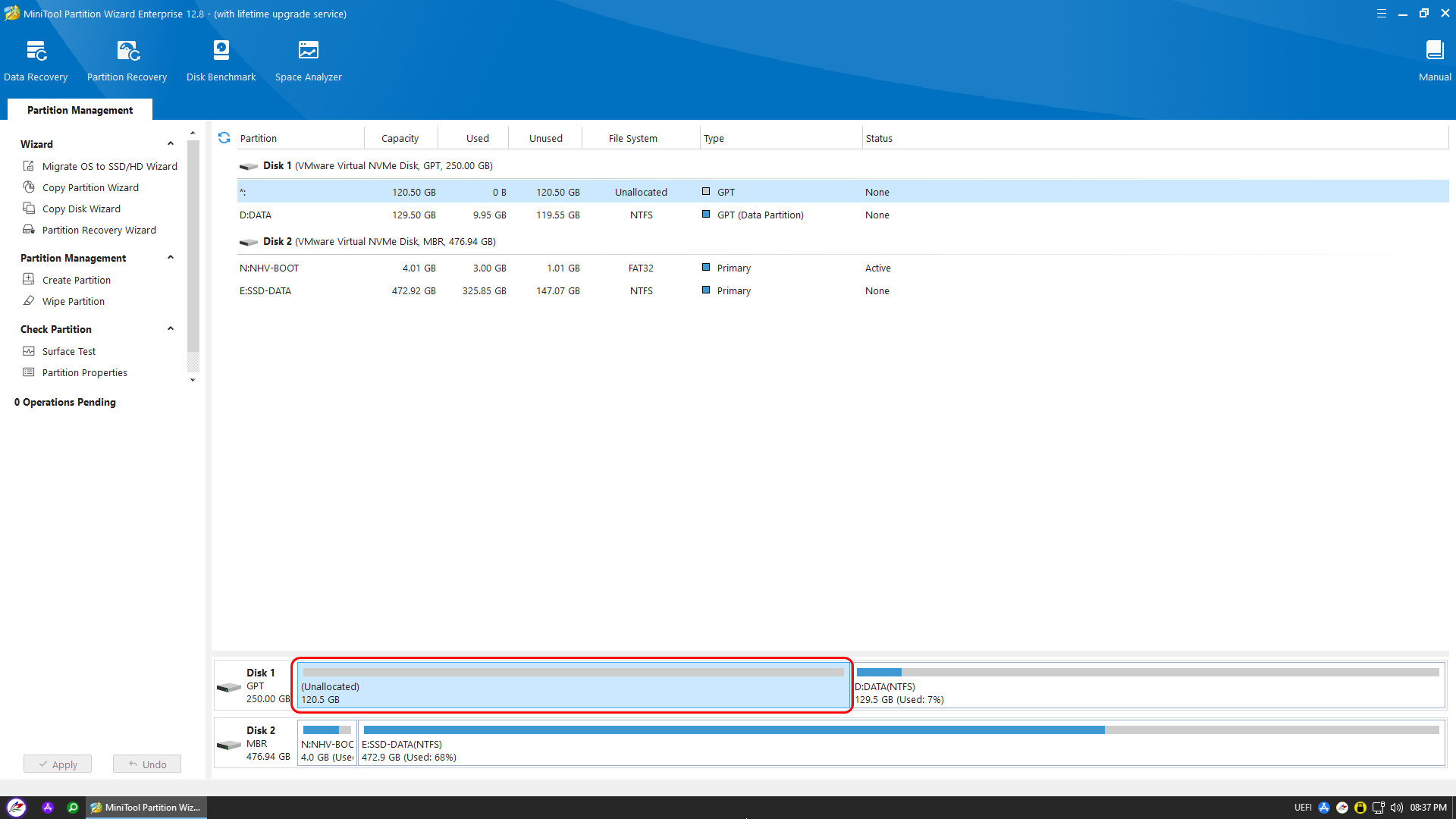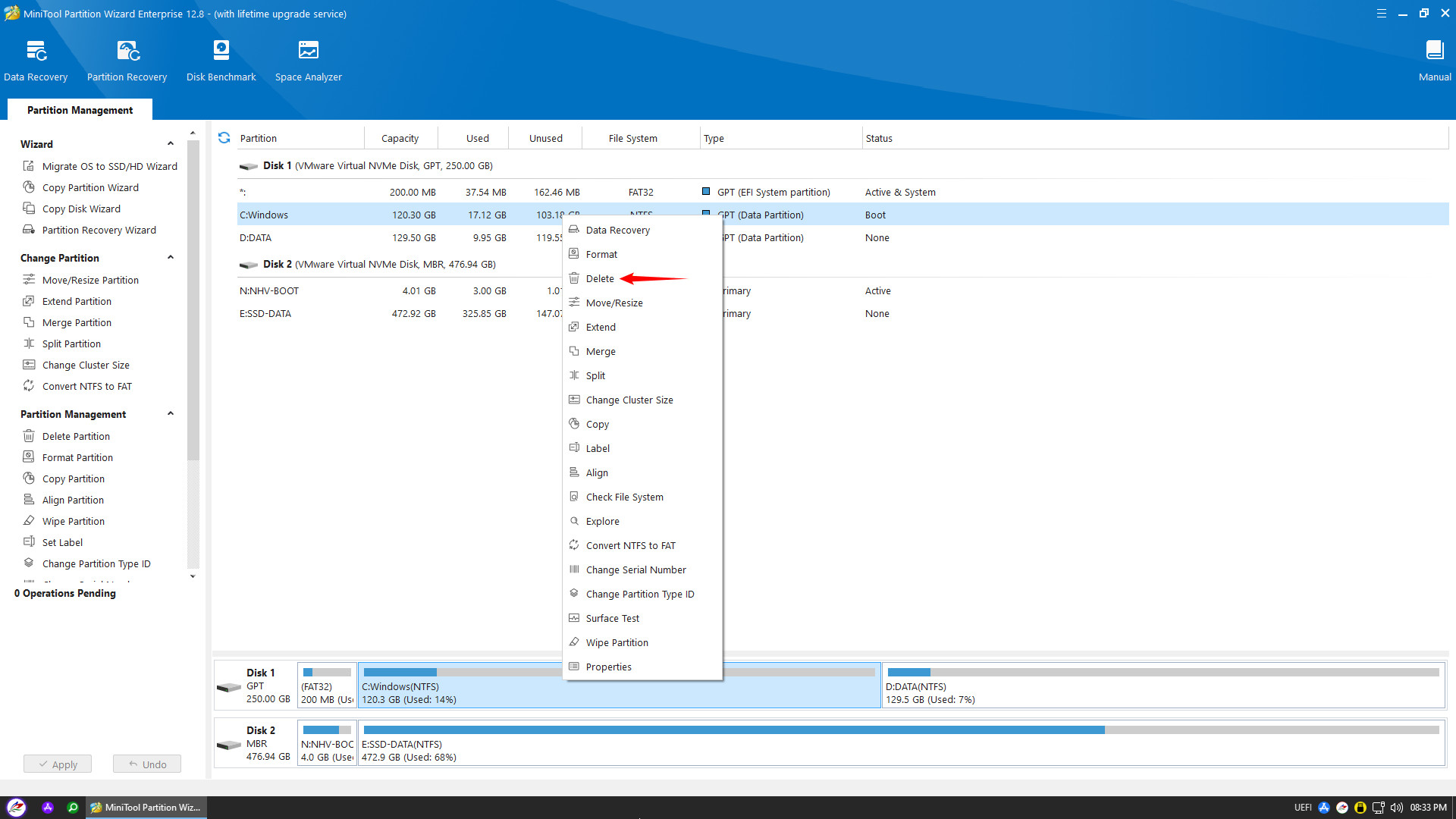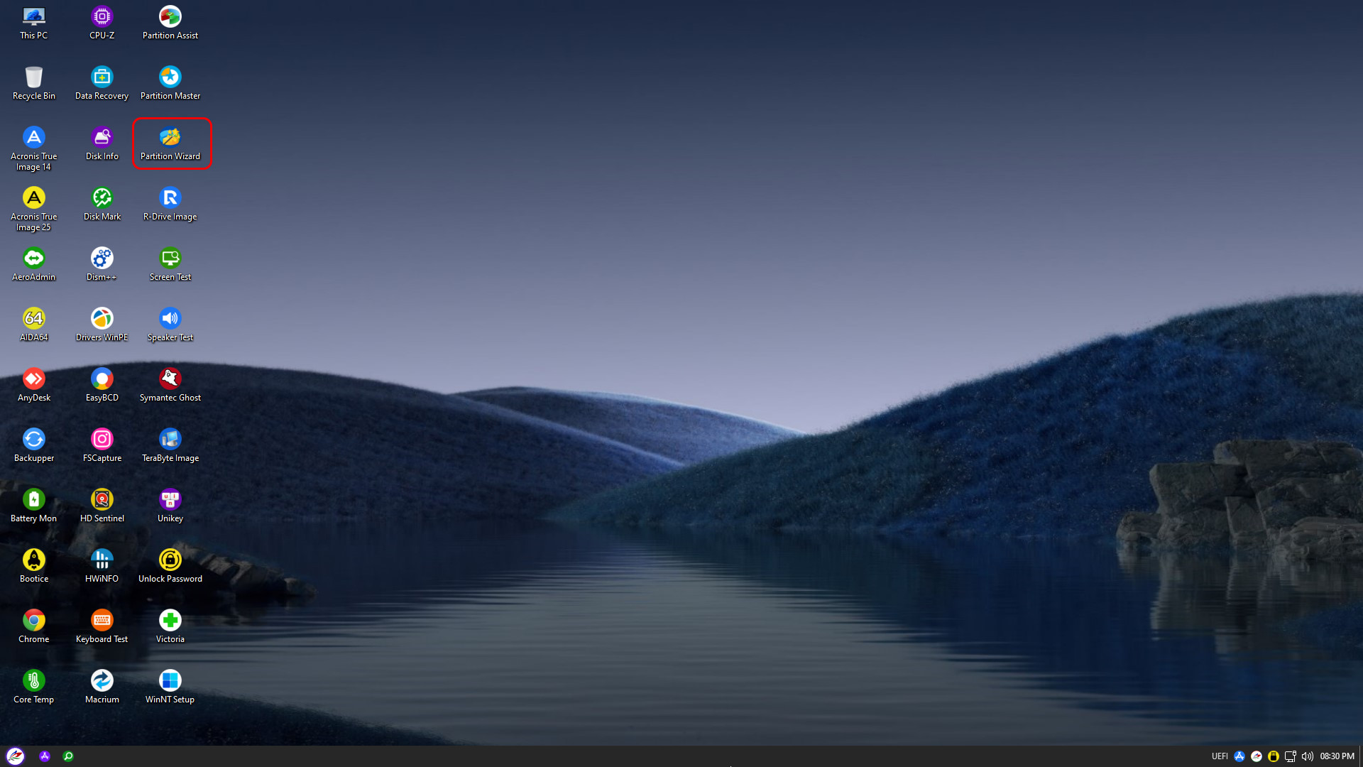 The first step in the installation process is to clean the drive. From the NHV BOOT Desktop interface, open the Partition Wizard tool to delete old Windows partitions or repartition the hard drive as desired