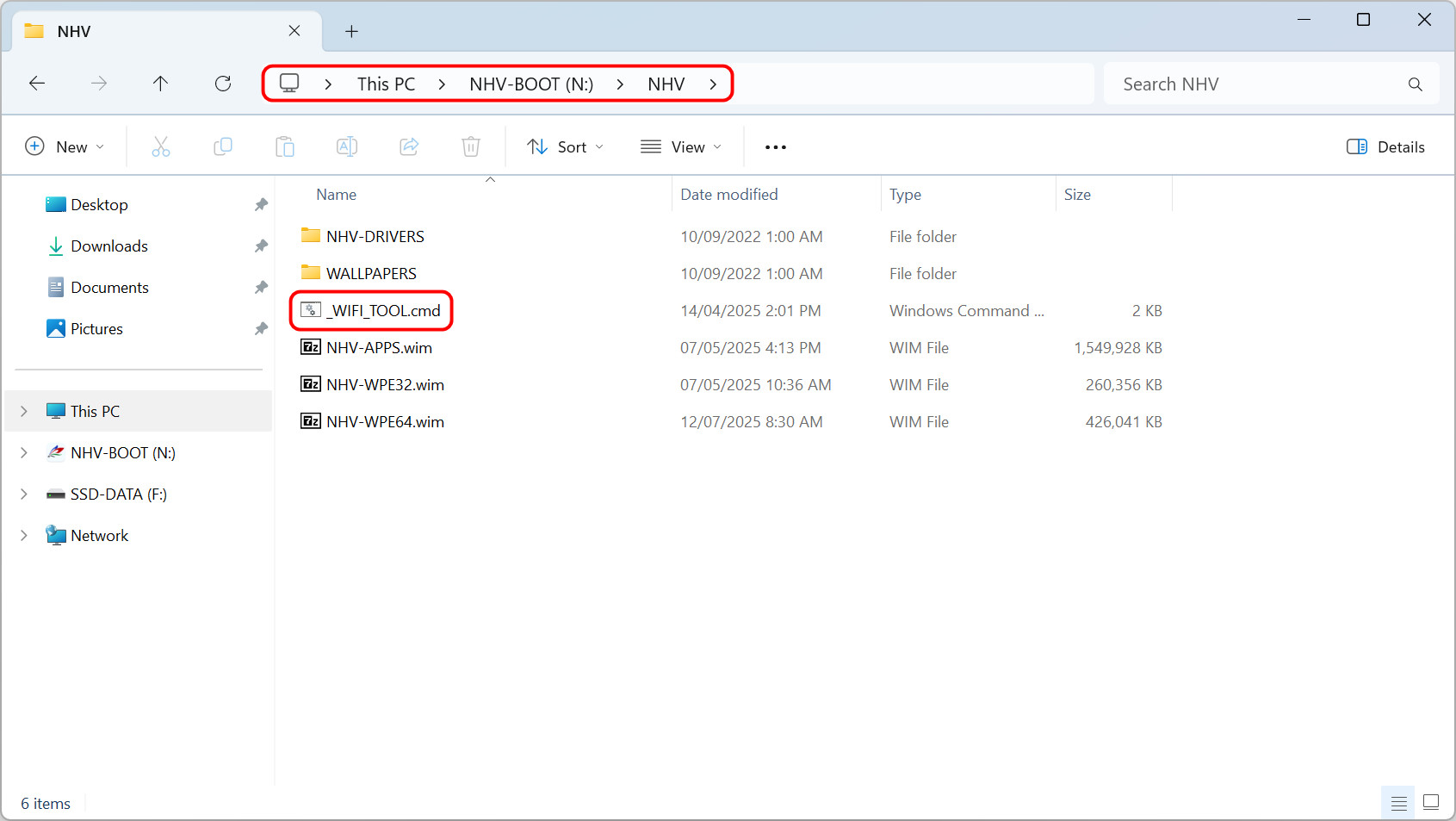 - Step 2: Access the USB drive, navigate to the path NHV-BOOT > NHV, find and run the file _WIFI_TOOL.cmd